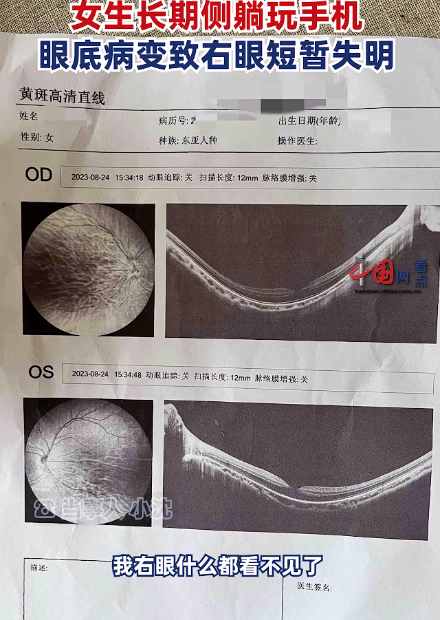 事件主人公小沈今年24岁,因长期喜欢向右侧躺玩手机,她的右眼近视高达600度,超出左眼一倍。近日一晚,小沈突发右眼短暂失明,次日一早又恢复正常。